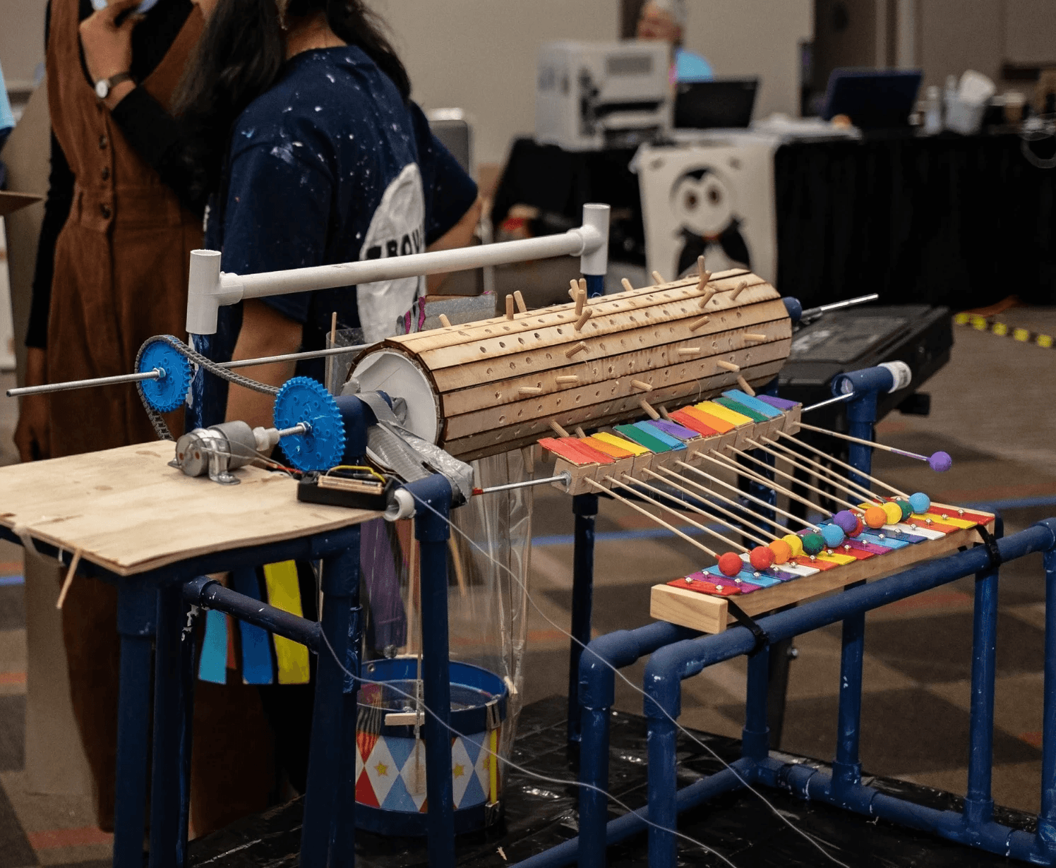 spins to create music on the xylophone and drum. With custom